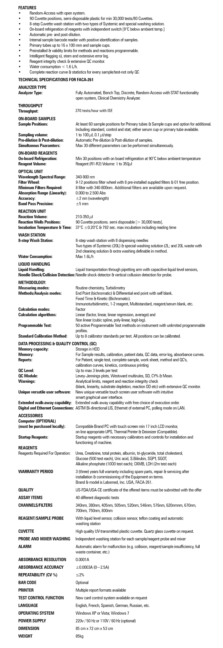 - Each set of FACA will come with one video to train in the installation, operation, and maintenance of the biochemistry analyzer.