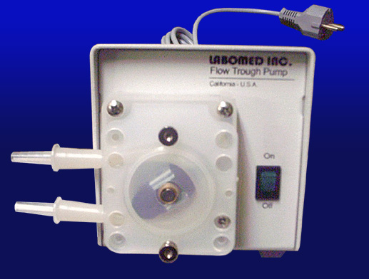 The Flow Through System Pump is a fixed-speed, self priming peristaltic pump. The peristaltic pump roller pressure squeezes fluid through the tubing. The flow is proportional to the speed of the rollers (rpm) and the inside diameter of the tubing). The pump can be used to pump fluid or gas without contaminating the pump; the pumped material contacts the tube only. TUBING SIZE